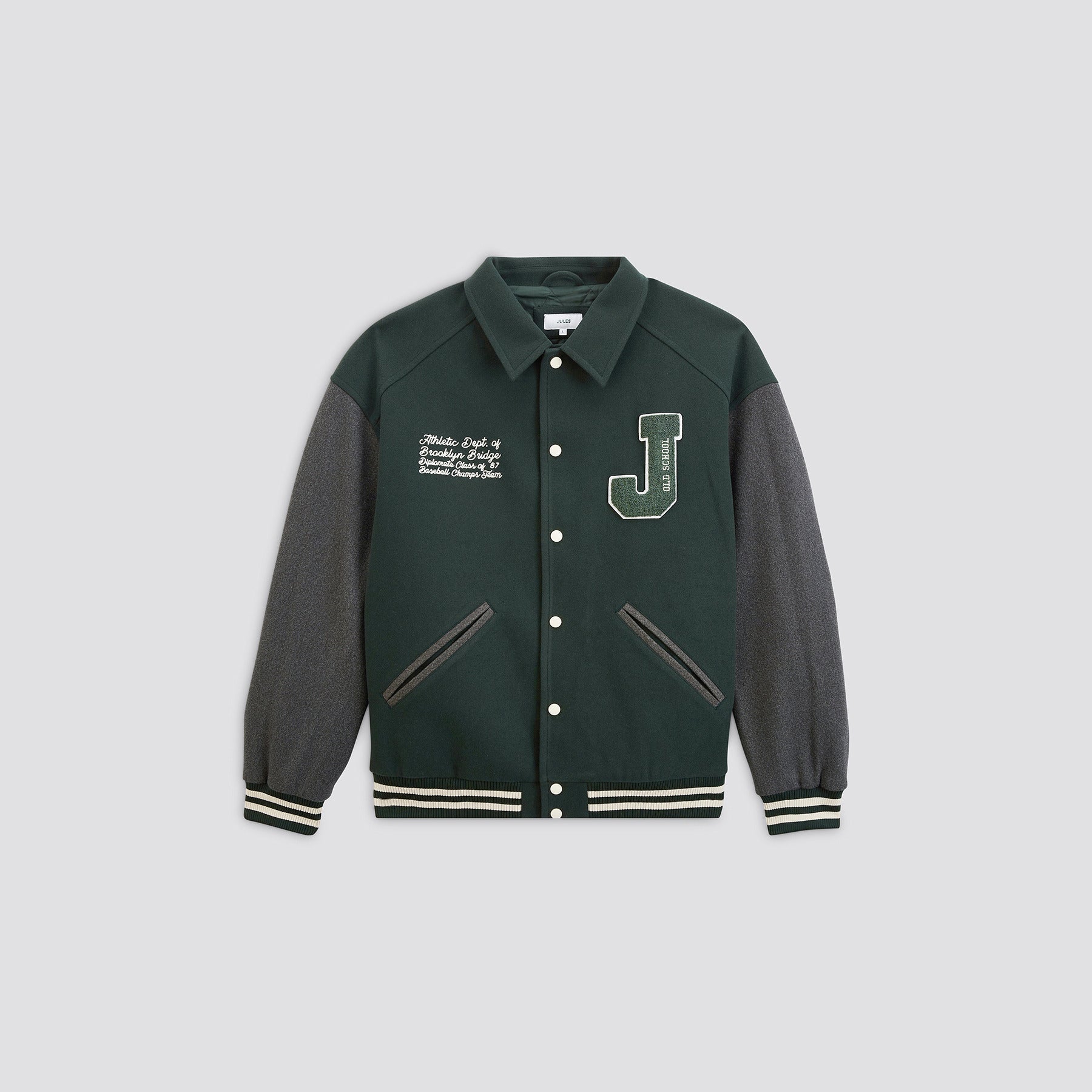 Ce blouson colorblock col chemise possède 2 poches passepoilées avant, une fermeture pressionnée, des broderies à la poitrine, une broderie Brooklyn N.Y.C au dos, un bas de corps et des bas de manches en bord-côtes et à rayures, un intérieur matelassé.