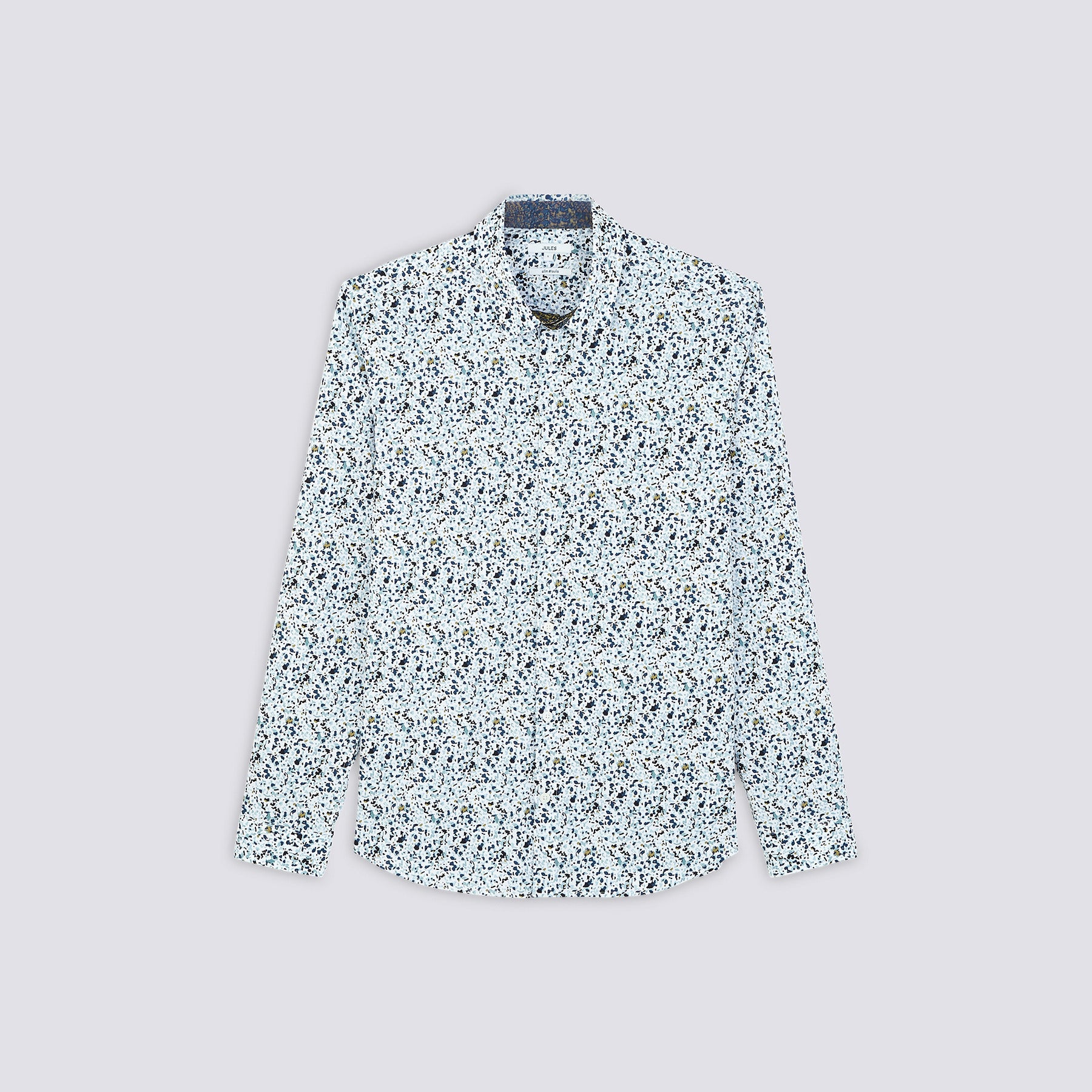 Cette chemise coupe slim est confectionnée dans une belle toile de coton souple légèrement stretch pour une grande liberté de mouvements. Cette chemise homme s'anime d'un motif minéral, composé dans une gamme de couleurs harmonieuses. Col français. Pied de col et doublure poignets contrastés.