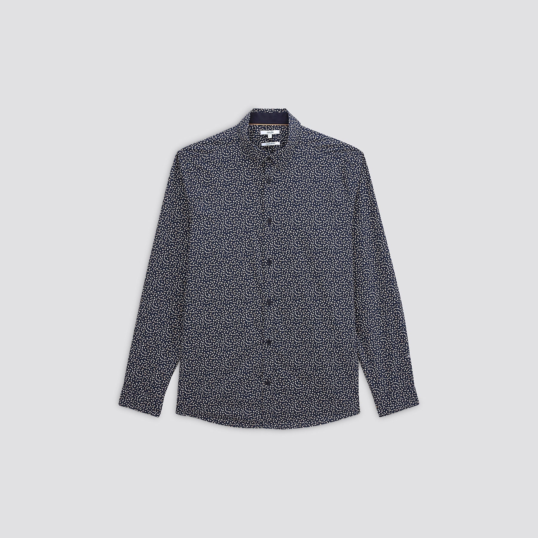 Cette chemise est animée d'un beau motif fantaisie sobre et élégant. Elle possède un col thermocollant; col renforcé par une bande thermocollante permettant de garantir un maintien optimal de celui-ci; et des poignées avec boutons. Sa coupe est regular, pour un porté cool.Le mannequin mesure 1m86 et porte une taille L.
