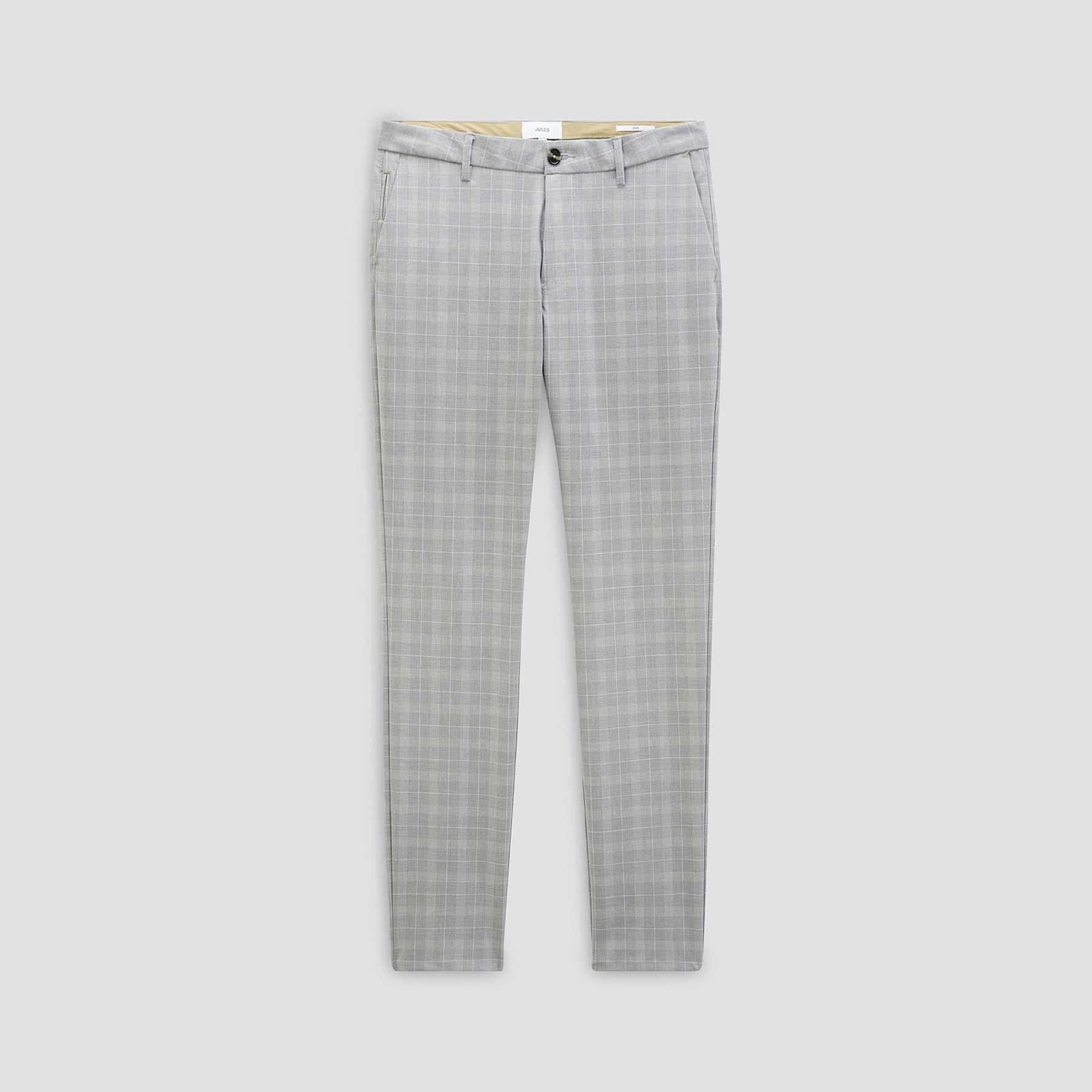 Ce pantalon chino à carreaux pied de poule gris clair dispose de 2 poches italiennes avant, 2 poches passepoilées boutonnées arrière, d'une fermeture boutonnée et d'une coupe slim, pour un porté près du corps.