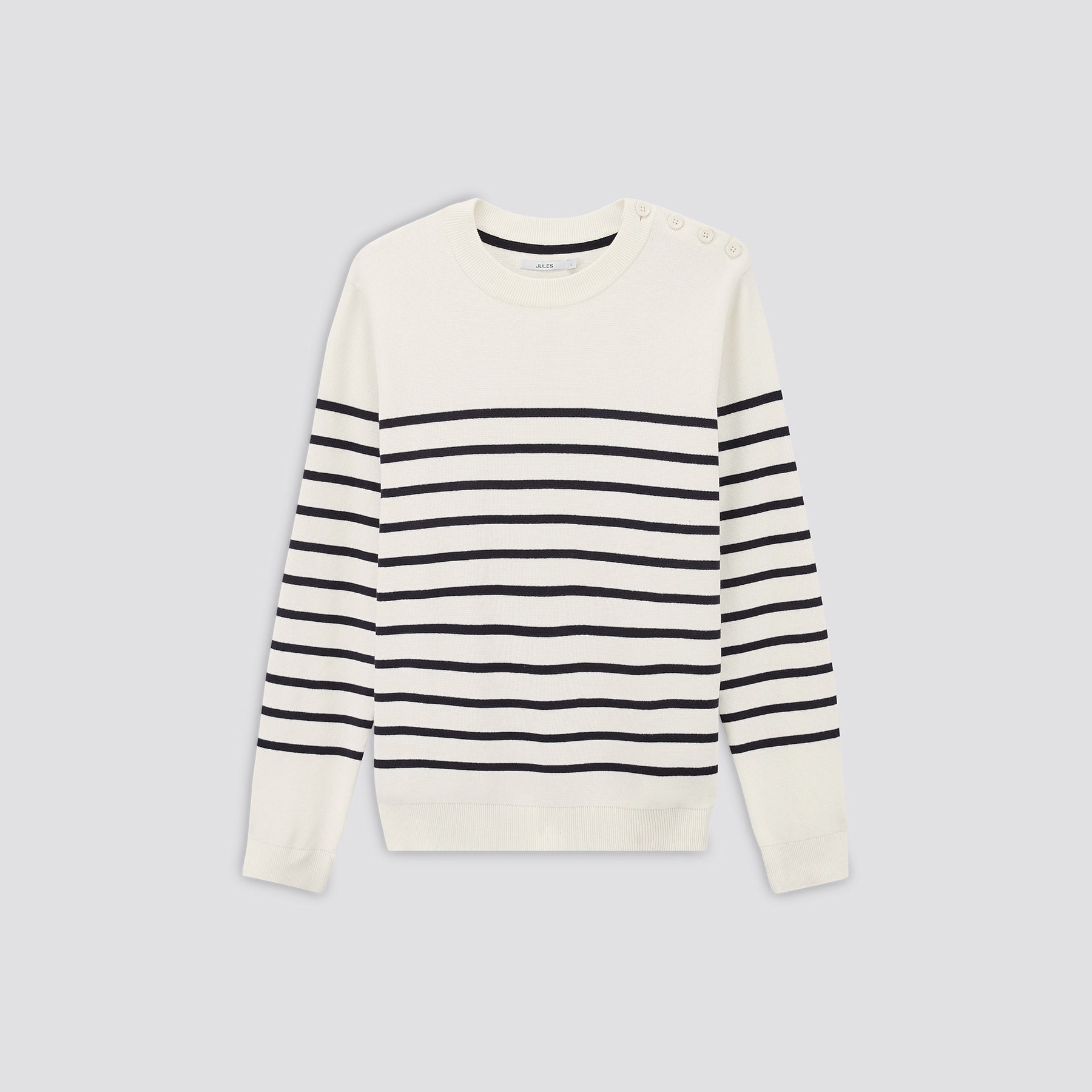 Ce pull marinière en coton et à col rond, avec un bas de corps et des bas de manches en bord-côtes, possède des boutons de fermeture sur l'épaule et une coupe regular, pour un porté cool et casual.Le mannequin mesure 1m86 et porte une taille L.